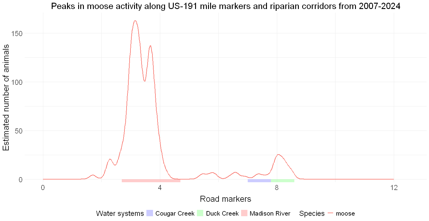 Figure 3. Moose activity peaks and the locations of riparian corridors along US-191 road markers from 2007-2024, showing that moose activity peaks are mainly centered around the Madison River.