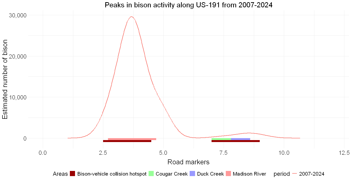 Figure 2. Bison activity peaks and the locations of riparian corridors along US-191 road markers from 2007-2024, showing that bison activity was centered around riparian corridors, the majority of which centered around the Madison River. Peaks in bison activity also correlated with bison-vehicle collision hotspots marked in dark red.