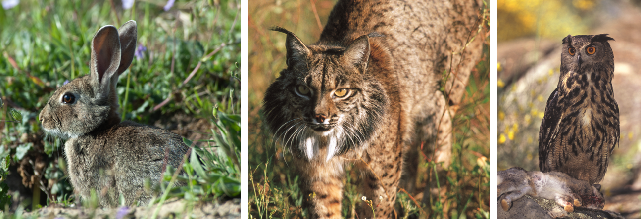 A prey (wild rabbit), a top predator (lynx) and a top predator with a prey (Eurasian eagle-owl). Photo credits: Joaquim Pedro Ferreira